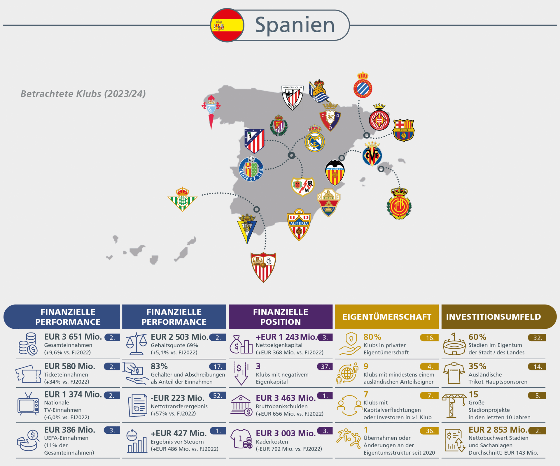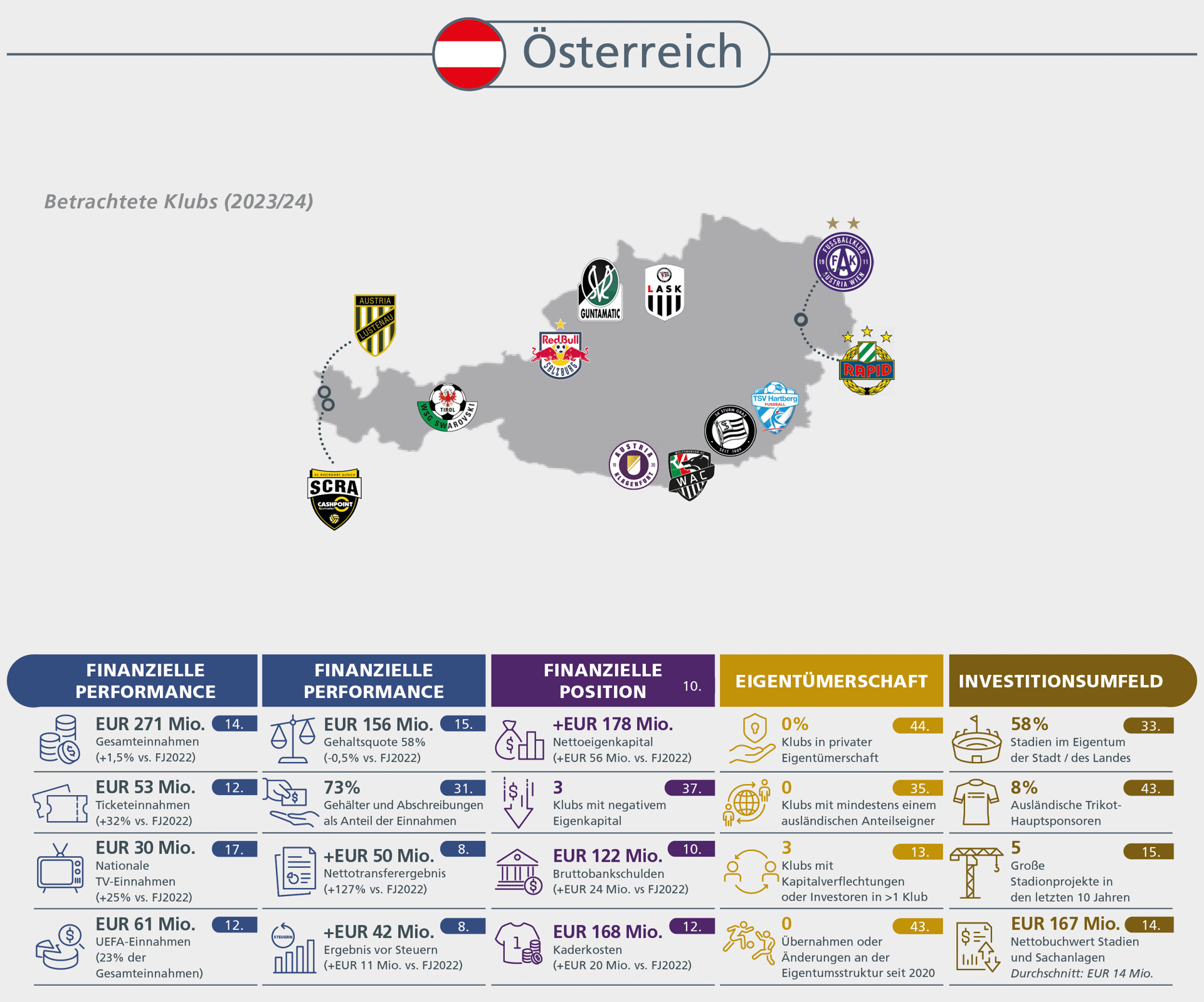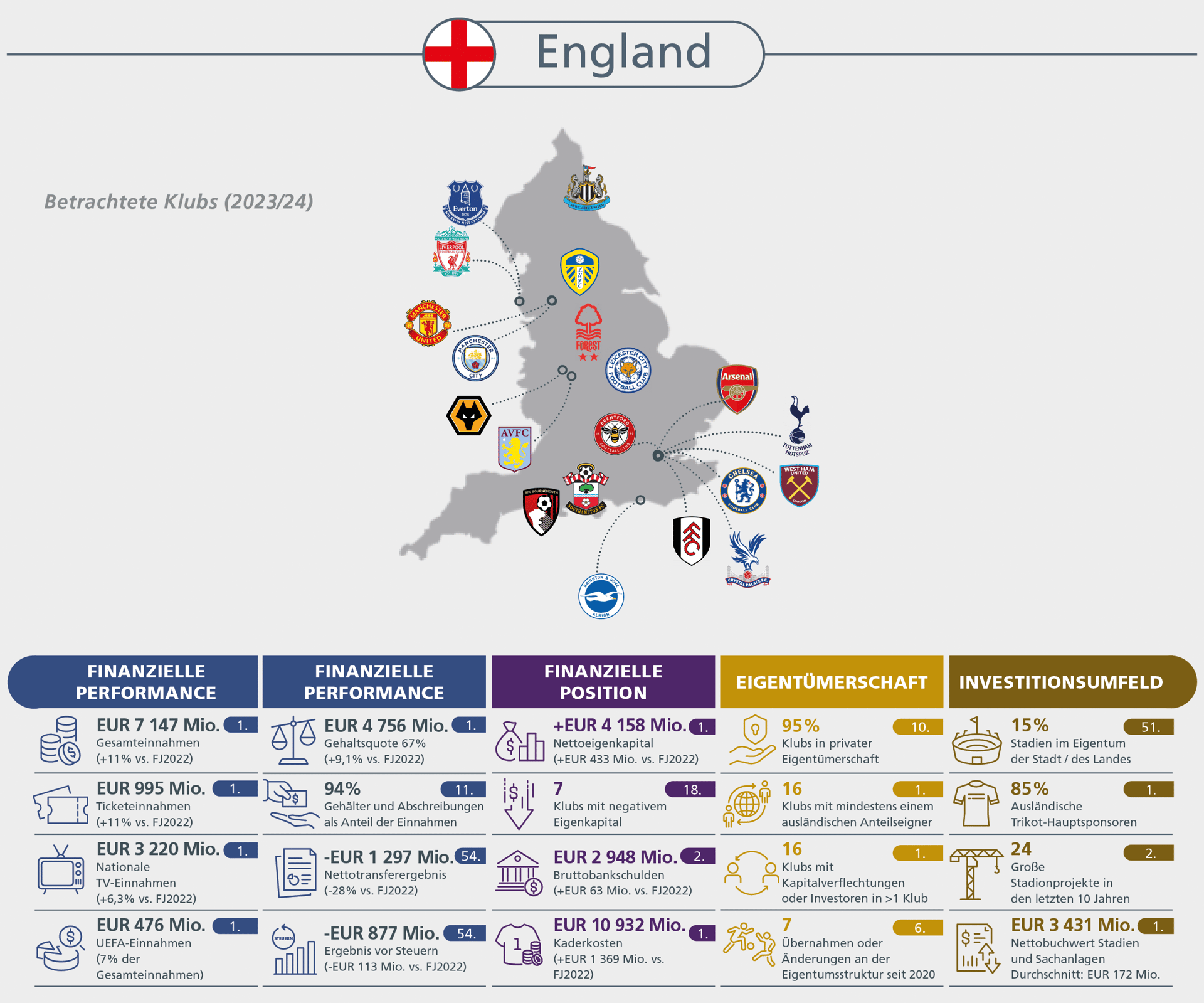 Spielergehälter auf Rekordniveau, aber mit nachhaltigeren Wachstumsraten. Hoher Inflationsdruck bei den übrigen Betriebskosten verhindert Rückkehr zu Profitabilität bei den Klubs.