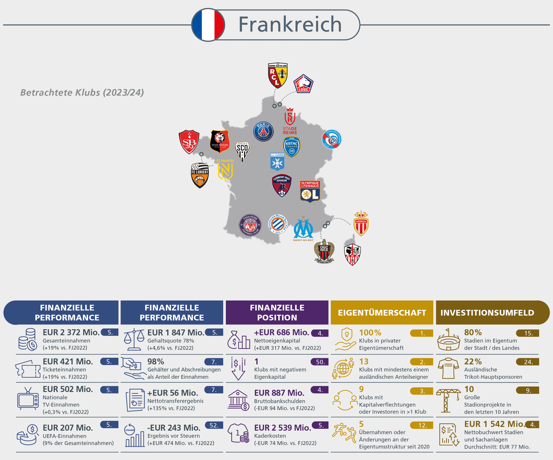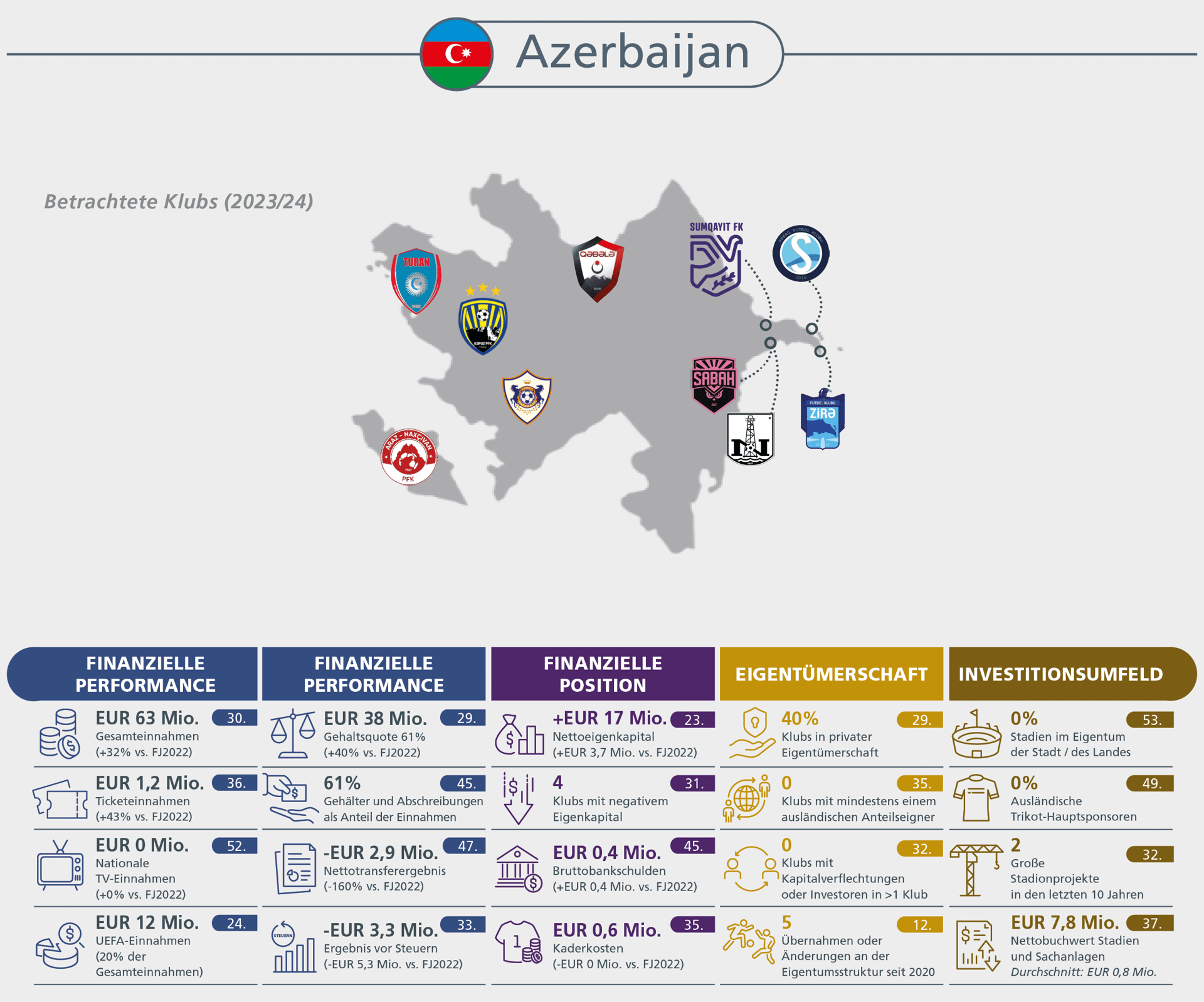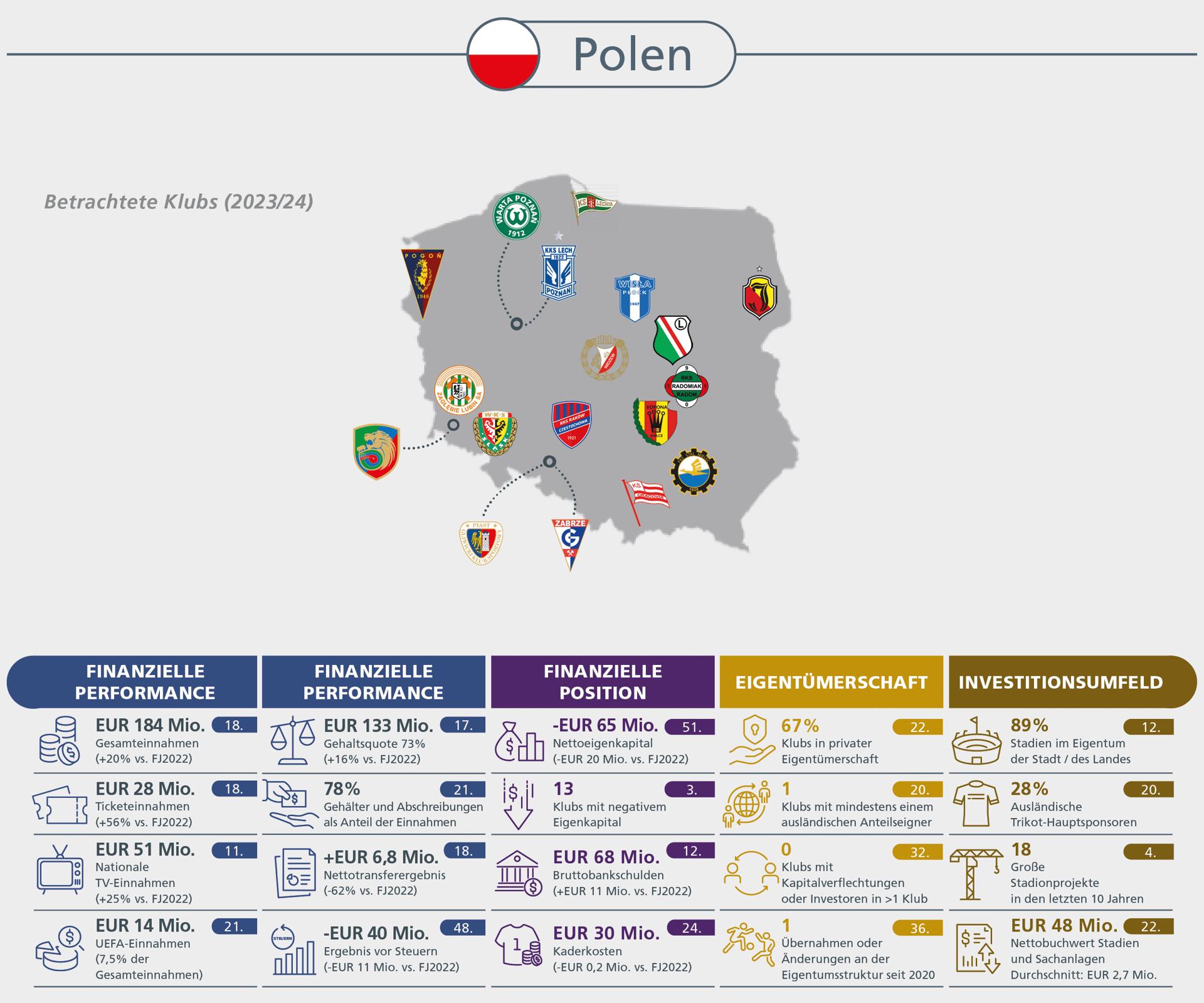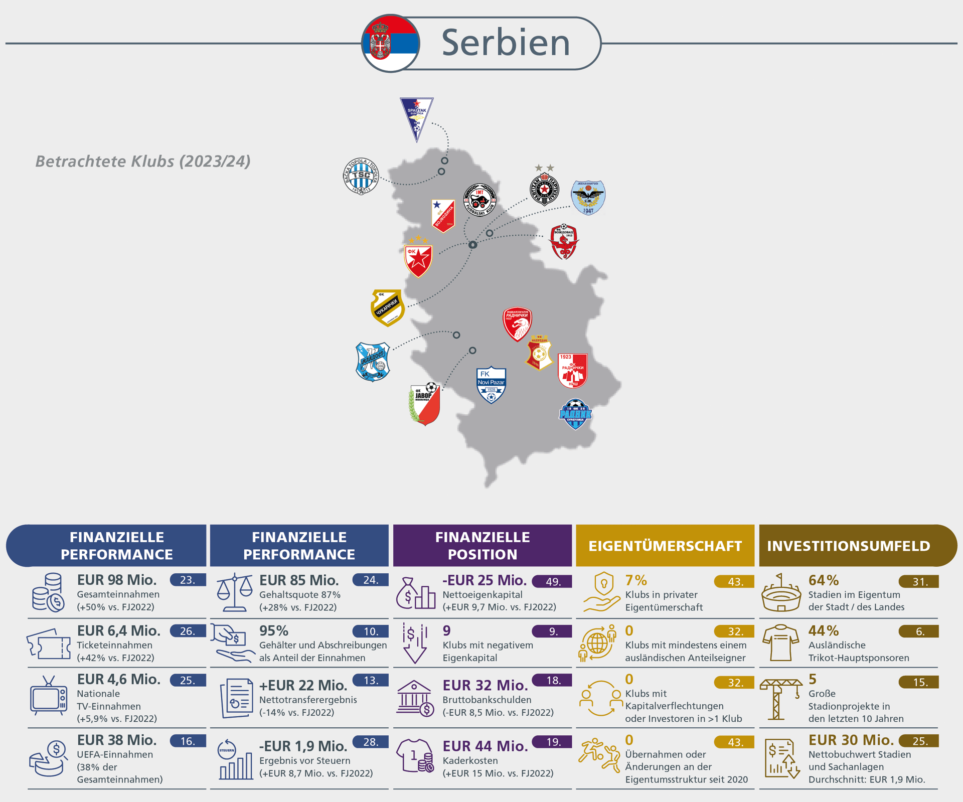Spielergehälter auf Rekordniveau, aber mit nachhaltigeren Wachstumsraten. Hoher Inflationsdruck bei den übrigen Betriebskosten verhindert Rückkehr zu Profitabilität bei den Klubs.